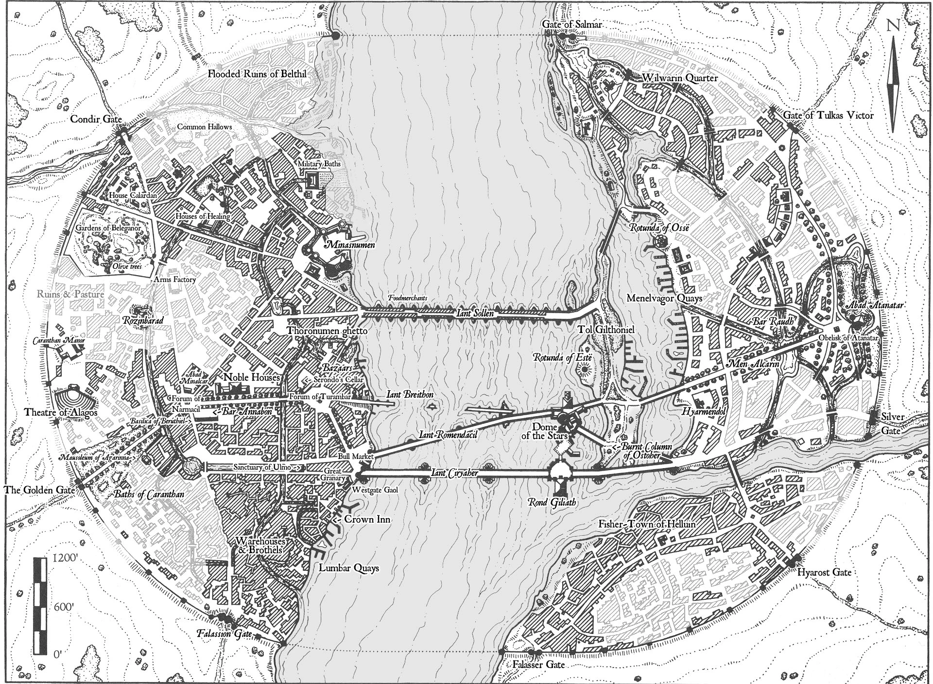 Estaba atravesada por el Anduin, que dividía en dos la ciudad. Las dos partes estaban comunicadas por un puente de piedra que fue destruido y reconstruido varias veces a lo largo de la historia.